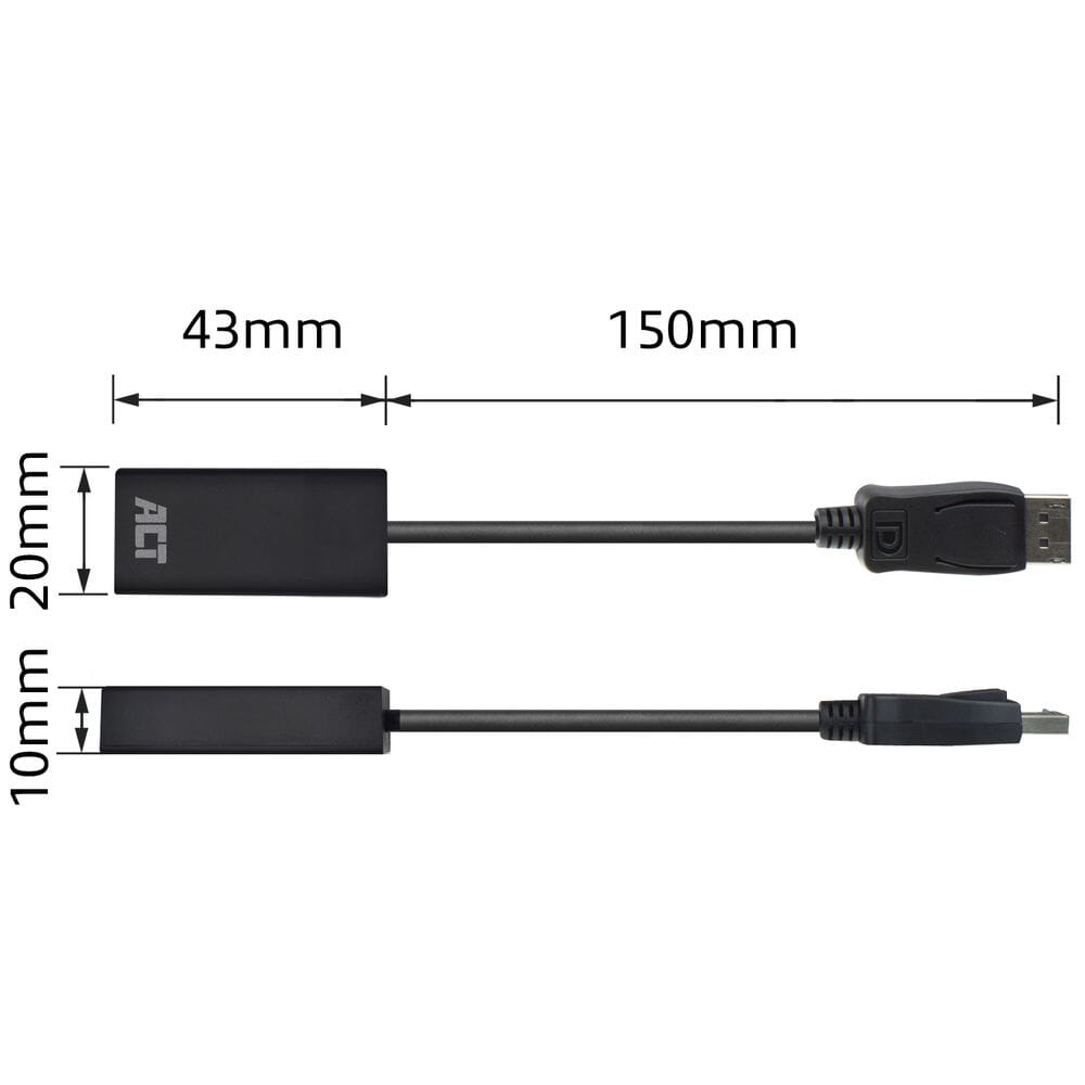 De ACT AC7555 DisplayPort naar HDMI Adapter verbindt uw laptop met DisplayPort-output met een monitor of beamer met HDMI. De maximale resolutie is 1920 x 1080 @ 60Hz or 3840 x 2160 (4K) @ 30Hz. De adapter heeft vergulde connectoren.